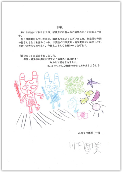 みのり作業所さまから、お礼のお手紙を頂きました。