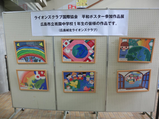 2016年11月30日から12月9日まで、祇園西公民館において、広島市立祇園中学校1年生の皆様に応募いただきました、国際平和ポスター「平和・万歳」への応募作品の優秀賞等に選ばれた作品15点を掲示しました。