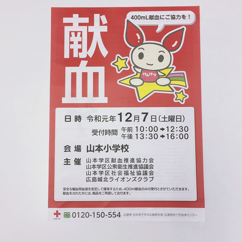 2019年12月7日 今年度第1回目の献血奉仕活動を山本小学校で行いました。