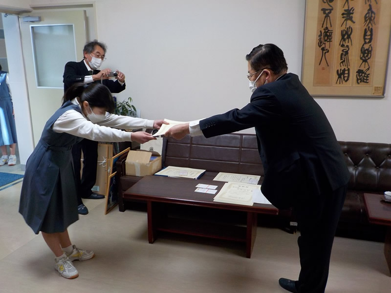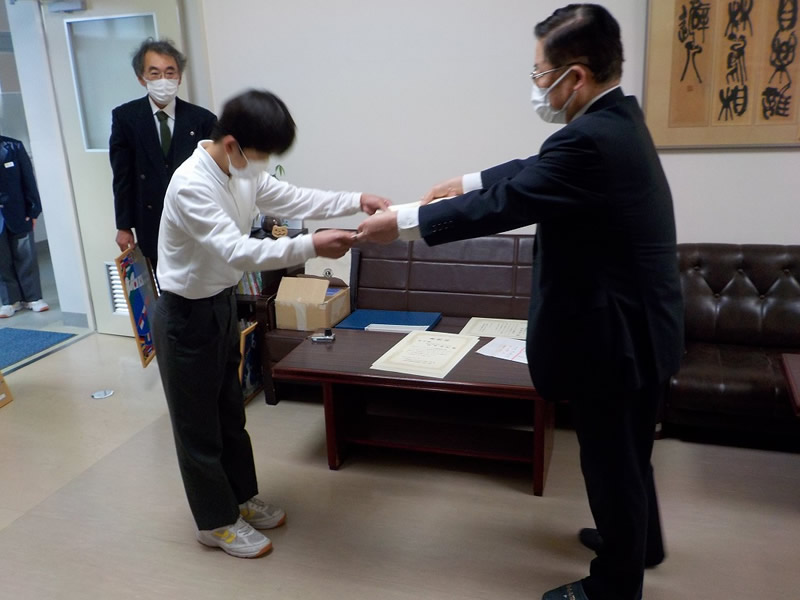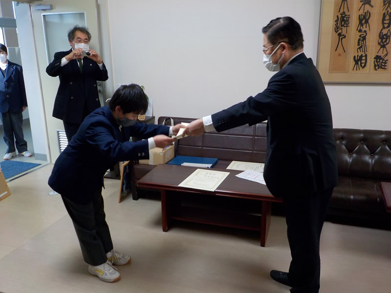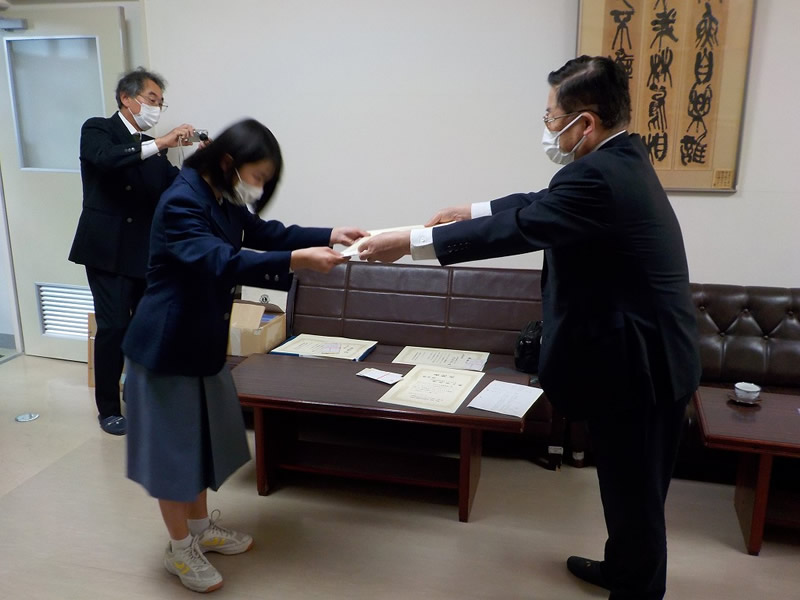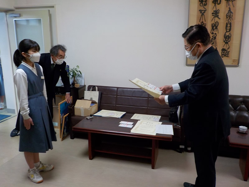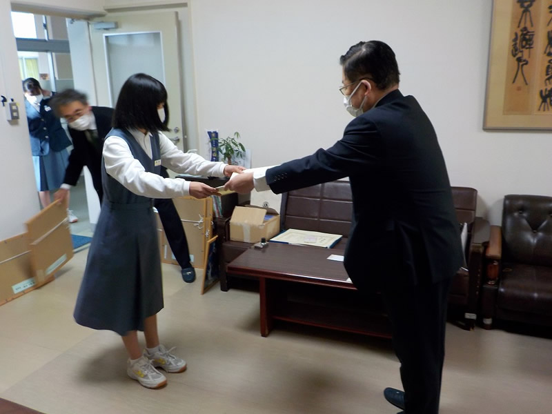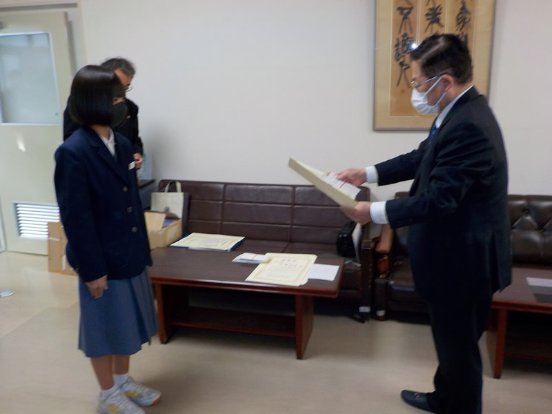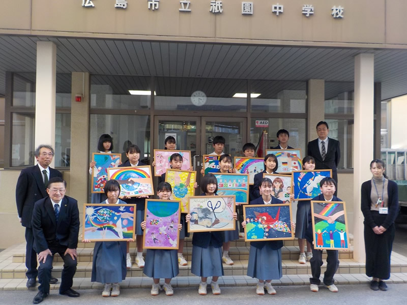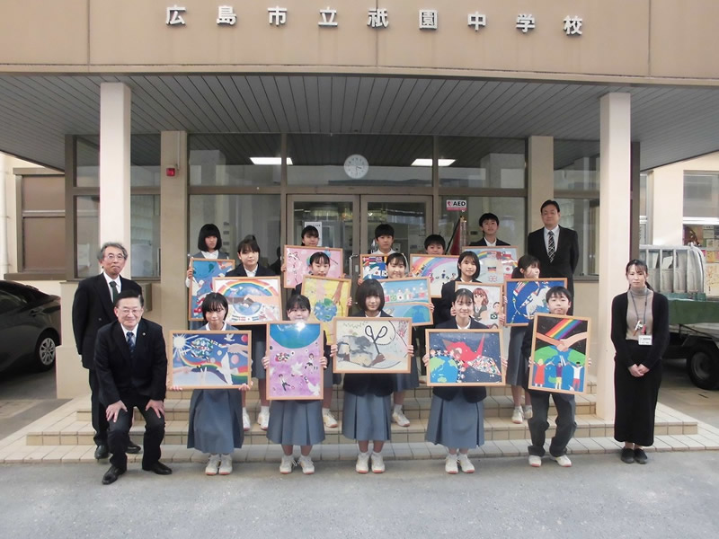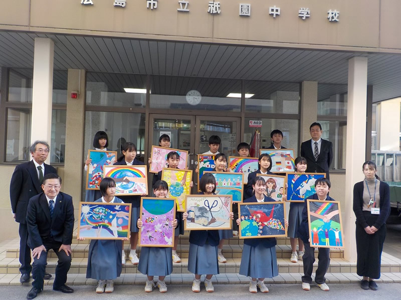 2021年12月6日、広島市立祇園中学校校長室にお邪魔して、平和ポスター優秀賞等の表彰式を行いました。