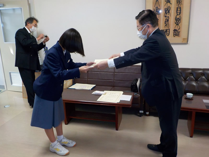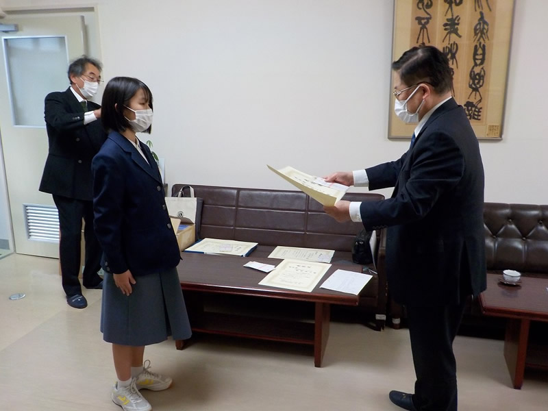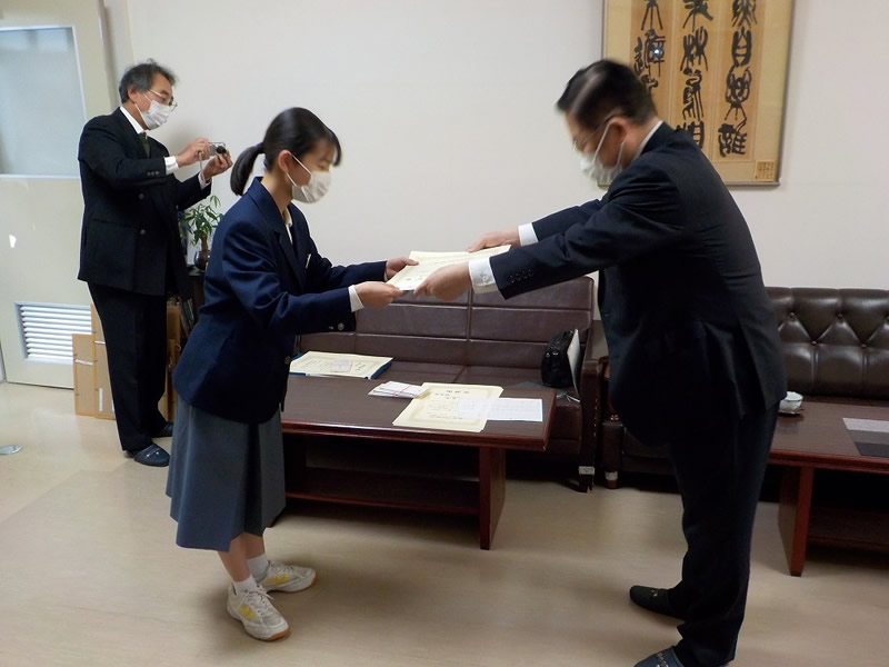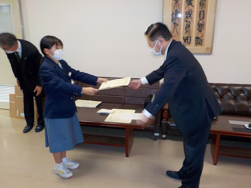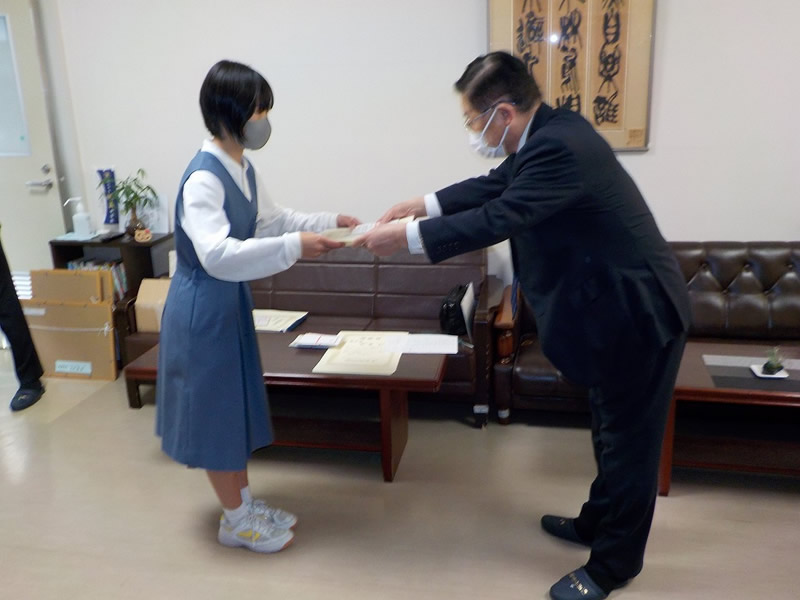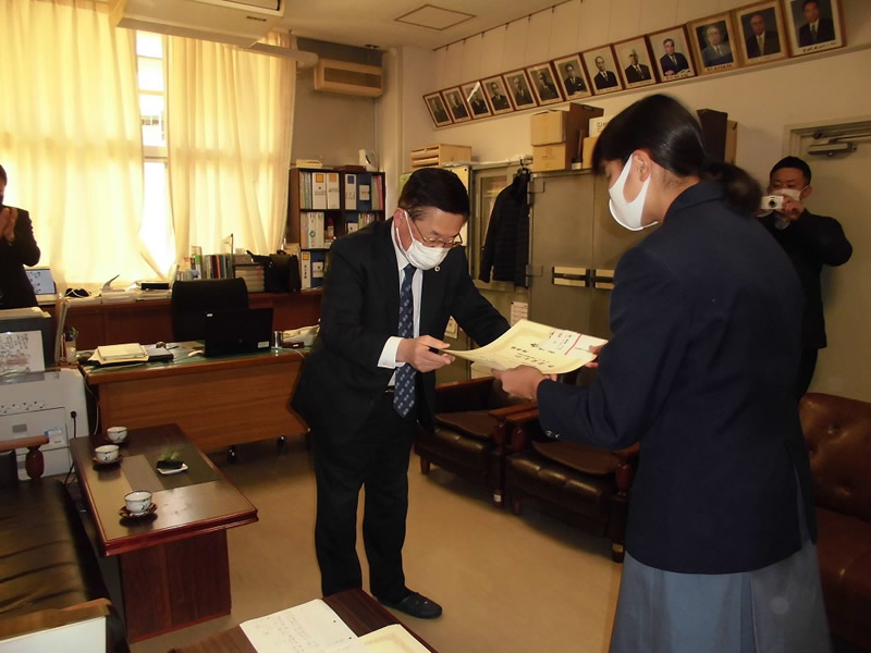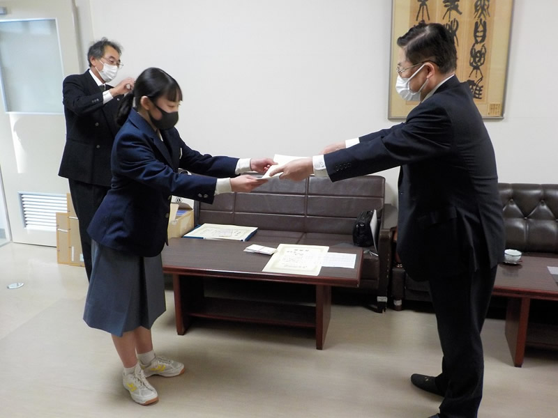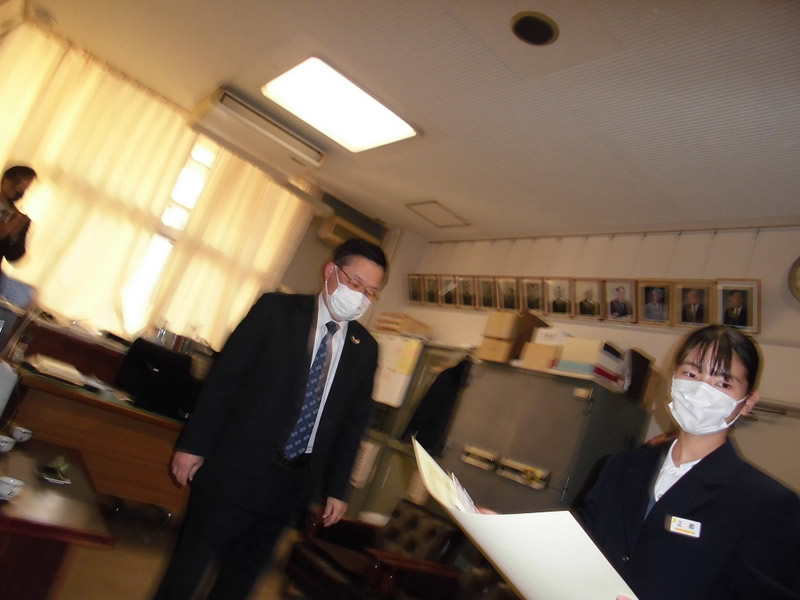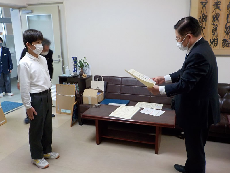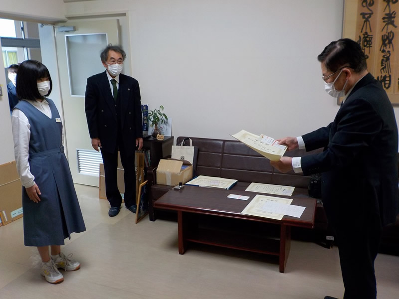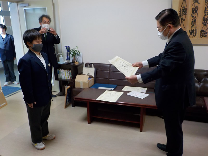 2021年12月6日、広島市立祇園中学校校長室にお邪魔して、平和ポスター優秀賞等の表彰式を行いました。