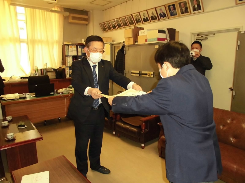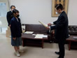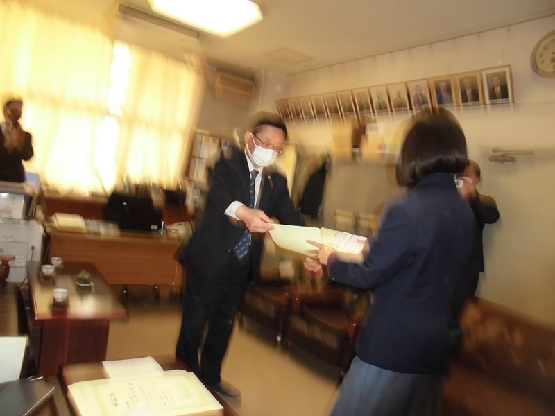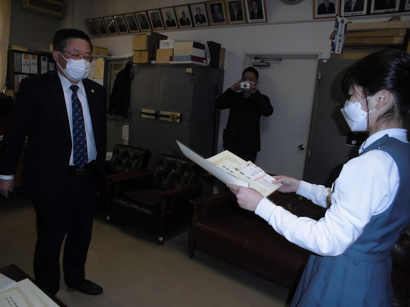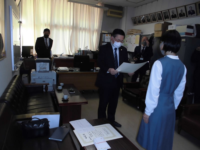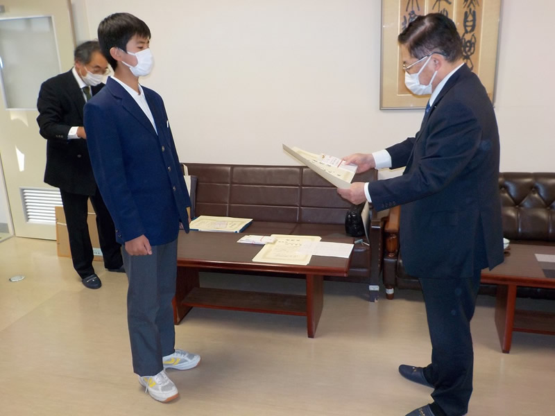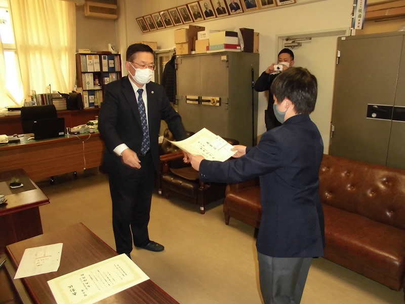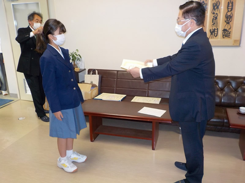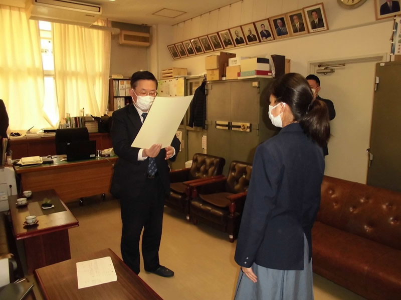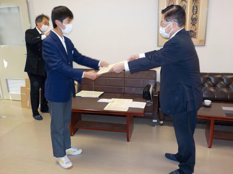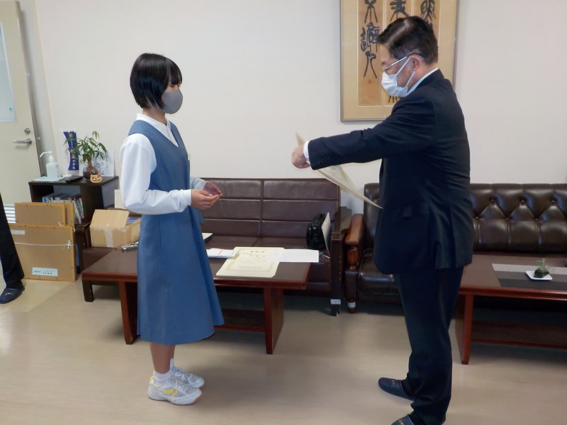 2021年12月6日、広島市立祇園中学校校長室にお邪魔して、平和ポスター優秀賞等の表彰式を行いました。